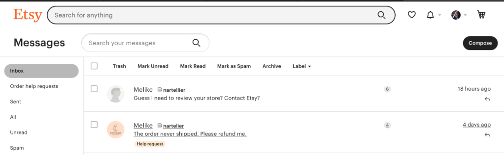 A year ago I ordered a poster from a shop named Nartelier on Etsy for $29. I was charged, yet the poster never shipped. Months went by, the shop owner changed their shop name to Nartellier (with two l’s). I’ve contacted them, and got a reply that they’d look into it. After a couple days with no follow up, see they changed their display name and the user has now zero follows, and no avatar. Here are some screenshots of the two exchanges in the messages inbox: